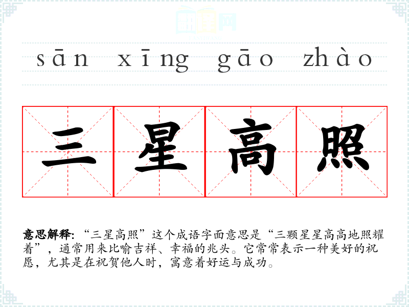“三星高照”这个成语字面意思是“三颗星星高高地照耀着”,通常用来比喻吉祥、幸福的兆头。它常常表示一种美好的祝愿,尤其是在祝贺他人时,寓意着好运与成功。