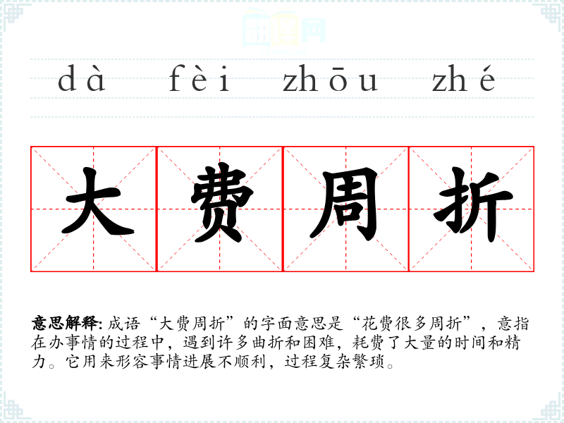 成语“大费周折”的字面意思是“花费很多周折”,意指在办事情的过程中,遇到许多曲折和困难,耗费了大量的时间和精力。它用来形容事情进展不顺利,过程复杂繁琐。