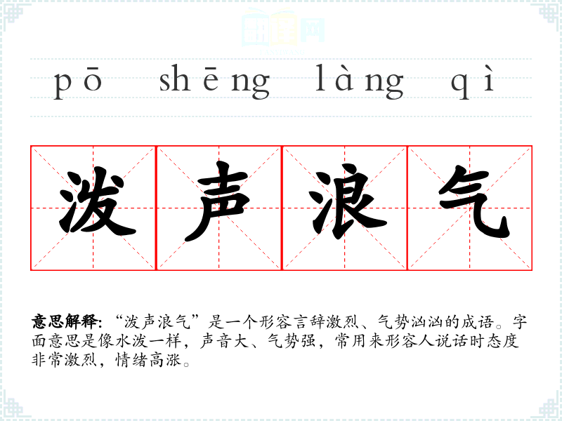 “泼声浪气”是一个形容言辞激烈、气势汹汹的成语。字面意思是像水泼一样,声音大、气势强,常用来形容人说话时态度非常激烈,情绪高涨。