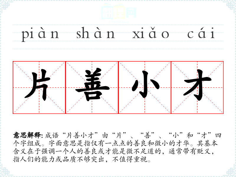 成语“片善小才”由“片”、“善”、“小”和“才”四个字组成。字面意思是指仅有一点点的善良和微小的才华。其基本含义在于强调一个人的善良或才能是微不足道的,通常带有贬义,指人们的能力或品质不够突出,不值得重视。