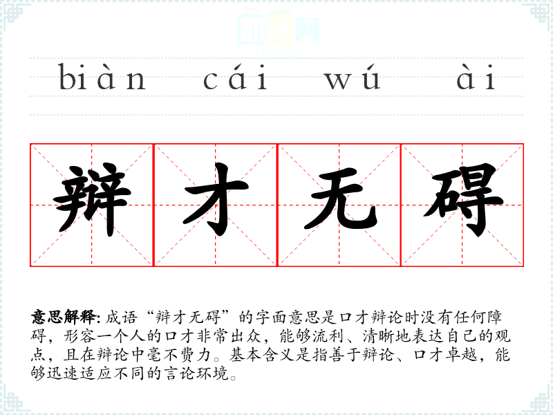 - 反义成语:口齿伶俐、言之无物。前者强调口才,但相比于“辩才无碍”更侧重于口齿的灵活,后者则表示言辞空洞。