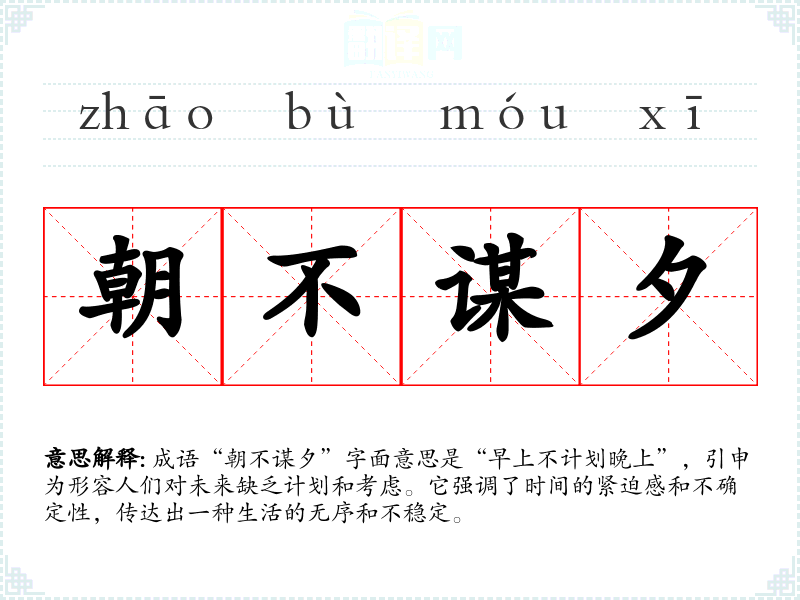 成语“朝不谋夕”字面意思是“早上不计划晚上”,引申为形容人们对未来缺乏计划和考虑。它强调了时间的紧迫感和不确定性,传达出一种生活的无序和不稳定。