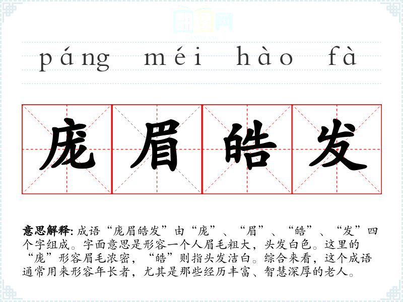 “庞眉皓发”并没有明确的历史典故,但可以从字面和文化角度推测其产生的背景。在**古代文化中,白发是智慧和长寿的象征,而浓眉则常常被视为一种面相的吉祥象征,表达人生经历的厚重和智慧的积累。