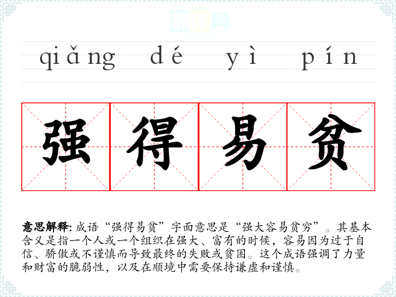 成语“强得易贫”字面意思是“强大容易贫穷”。其基本含义是指一个人或一个组织在强大、富有的时候,容易因为过于自信、骄傲或不谨慎而导致最终的失败或贫困。这个成语强调了力量和财富的脆弱性,以及在顺境中需要保持谦虚和谨慎。