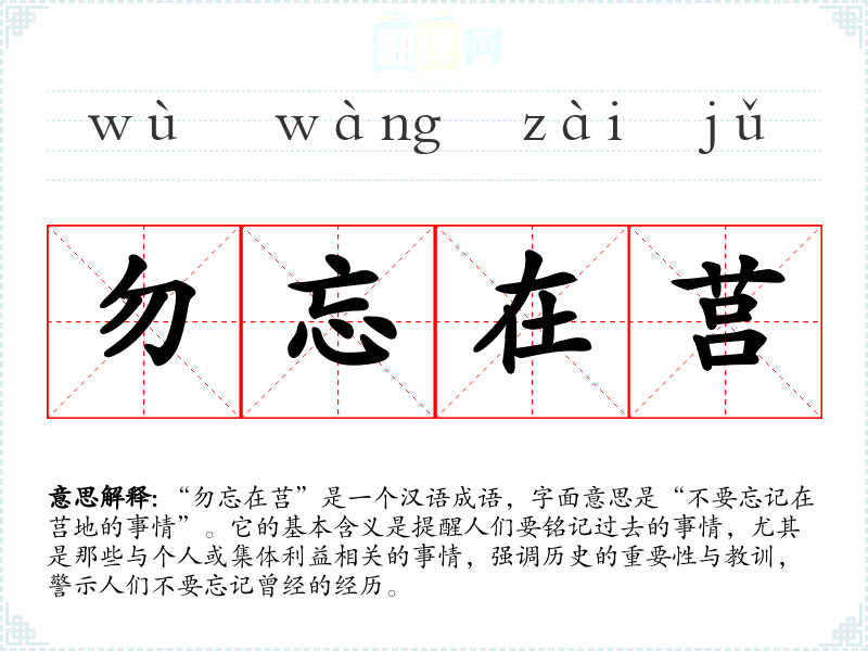 “勿忘在莒”是一个汉语成语,字面意思是“不要忘记在莒地的事情”。它的基本含义是提醒人们要铭记过去的事情,尤其是那些与个人或集体利益相关的事情,强调历史的重要性与教训,警示人们不要忘记曾经的经历。