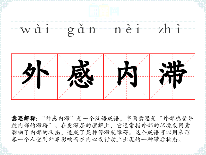 “外感内滞”是一个汉语成语,字面意思是“外部感受导致内部的滞碍”。在更深层的理解上,它通常指外部的环境或因素影响了内部的状态,造成了某种停滞或障碍。这个成语可以用来形容一个人受到外界影响而在内心或行动上出现的一种滞后状态。