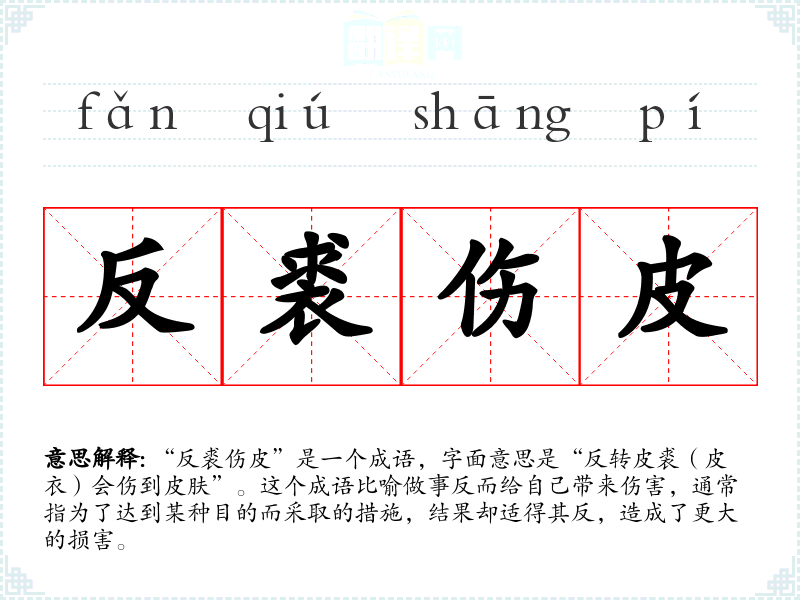 “反裘伤皮”是一个成语,字面意思是“反转皮裘(皮衣)会伤到皮肤”。这个成语比喻做事反而给自己带来伤害,通常指为了达到某种目的而采取的措施,结果却适得其反,造成了更大的损害。