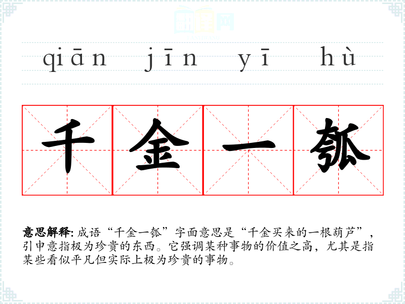 成语“千金一瓠”字面意思是“千金买来的一根葫芦”,引申意指极为珍贵的东西。它强调某种事物的价值之高,尤其是指某些看似平凡但实际上极为珍贵的事物。