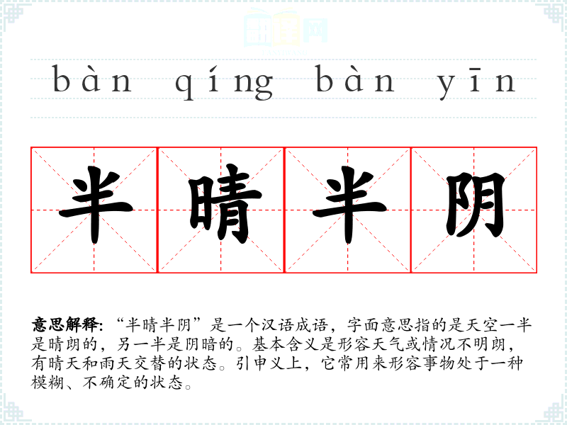 该成语的具体来源不详,但可以推测它与**传统文化中对自然现象的观察和描述有关。古代文人常以天气变化来象征人生的起伏、情感的波动,因而“半晴半阴”也可能蕴含着对生活状态的深刻体悟。