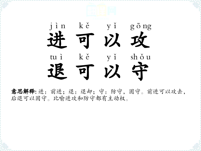 进:前进;退:退却;守:防守,固守。前进可以攻击,后退可以固守。比喻进攻和防守都有主动权。 |