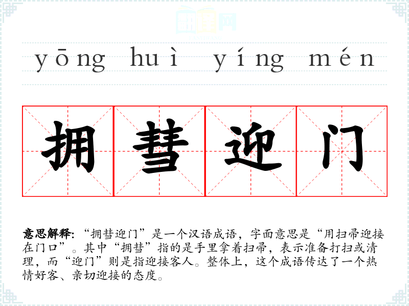 | 拥彗扫门 | 彗:扫帚。手持扫帚,为贵宾在前面扫地引路。形容待客之礼极为诚敬。 |