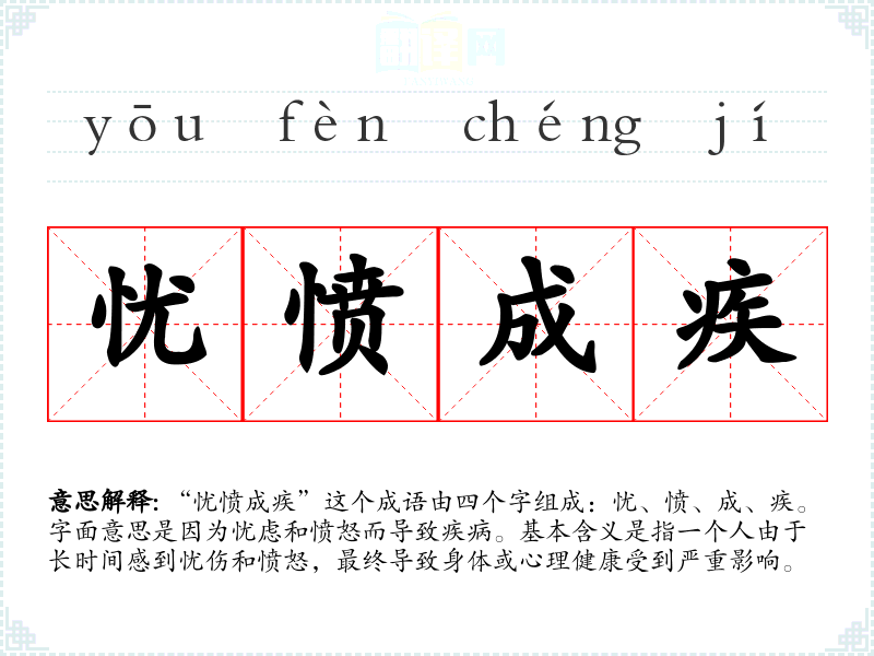 “忧愤成疾”这个成语由四个字组成:忧、愤、成、疾。字面意思是因为忧虑和愤怒而导致疾病。基本含义是指一个人由于长时间感到忧伤和愤怒,最终导致身体或心理健康受到严重影响。