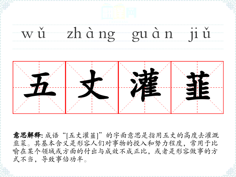 成语“[五丈灌韮]”的字面意思是指用五丈的高度去灌溉韭菜。其基本含义是形容人们对事物的投入和努力程度,常用于比喻在某个领域或方面的付出与成效不成正比,或者是形容做事的方式不当,导致事倍功半。