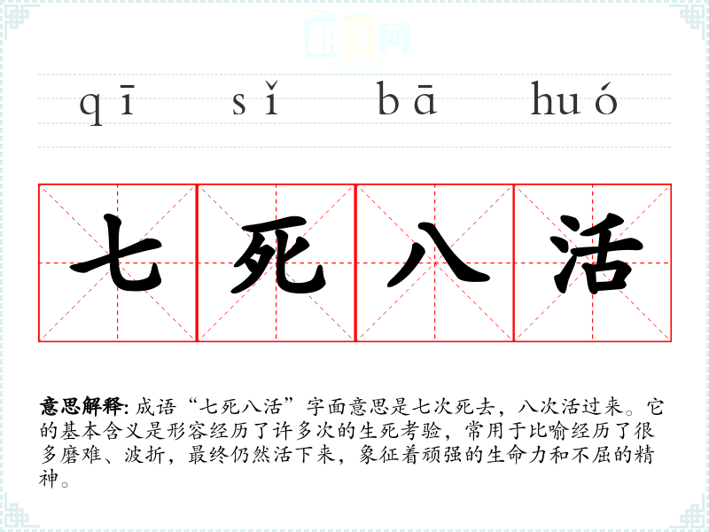 成语“七死八活”字面意思是七次死去,八次活过来。它的基本含义是形容经历了许多次的生死考验,常用于比喻经历了很多磨难、波折,最终仍然活下来,象征着顽强的生命力和不屈的精神。