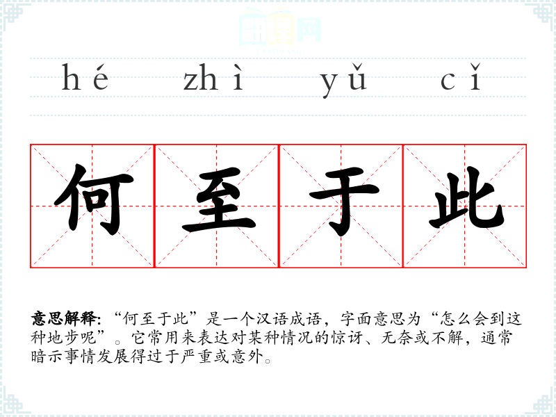 “何至于此”是一个汉语成语,字面意思为“怎么会到这种地步呢”。它常用来表达对某种情况的惊讶、无奈或不解,通常暗示事情发展得过于严重或意外。