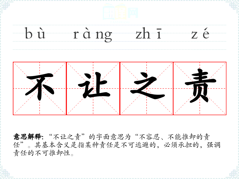 “不让之责”的字面意思为“不容忍、不能推卸的责任”。其基本含义是指某种责任是不可逃避的,必须承担的,强调责任的不可推卸性。