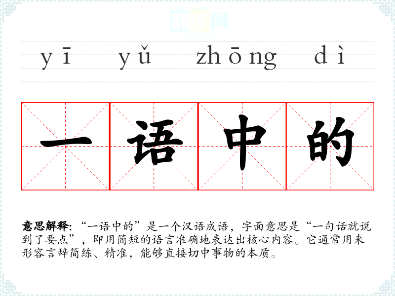 “一语中的”是一个汉语成语,字面意思是“一句话就说到了要点”,即用简短的语言准确地表达出核心内容。它通常用来形容言辞简练、精准,能够直接切中事物的本质。