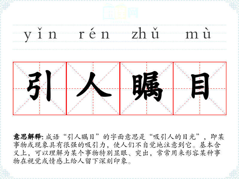 成语“引人瞩目”的字面意思是“吸引人的目光”,即某事物或现象具有很强的吸引力,使人们不自觉地注意到它。基本含义上,可以理解为某个事物特别显眼、突出,常常用来形容某种事物在视觉或情感上给人留下深刻印象。