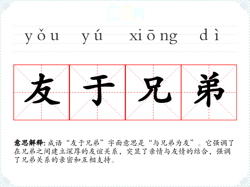 成语“友于兄弟”字面意思是“与兄弟为友”。它强调了在兄弟之间建立深厚的友谊关系,突显了亲情与友情的结合,强调了兄弟关系的亲密和互相支持。