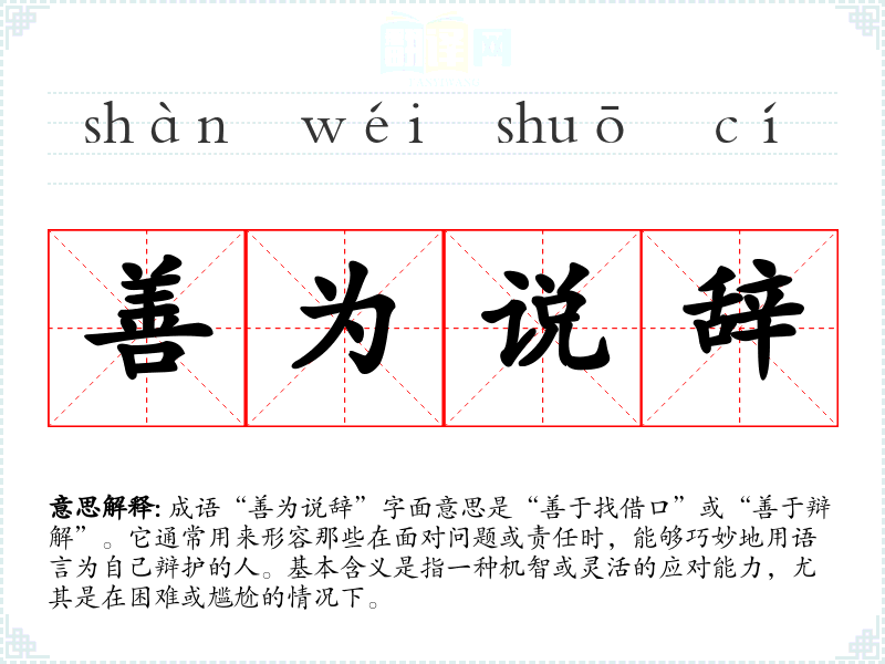 成语“善为说辞”字面意思是“善于找借口”或“善于辩解”。它通常用来形容那些在面对问题或责任时,能够巧妙地用语言为自己辩护的人。基本含义是指一种机智或灵活的应对能力,尤其是在困难或尴尬的情况下。