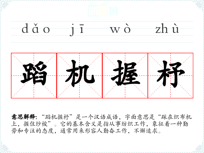 “蹈机握杼”是一个汉语成语,字面意思是“踩在织布机上,握住纱梭”。它的基本含义是指从事纺织工作,象征着一种勤劳和专注的态度,通常用来形容人勤奋工作,不懈追求。