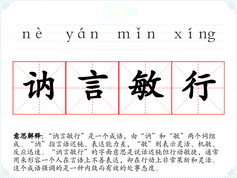 “讷言敏行”是一个成语,由“讷”和“敏”两个词组成。“讷”指言语迟钝、表达能力差,“敏”则表示灵活、机敏、反应迅速。“讷言敏行”的字面意思是说话迟钝但行动敏捷,通常用来形容一个人在言语上不善表达,却在行动上非常果断和灵活。这个成语强调的是一种内敛而有效的处事态度。